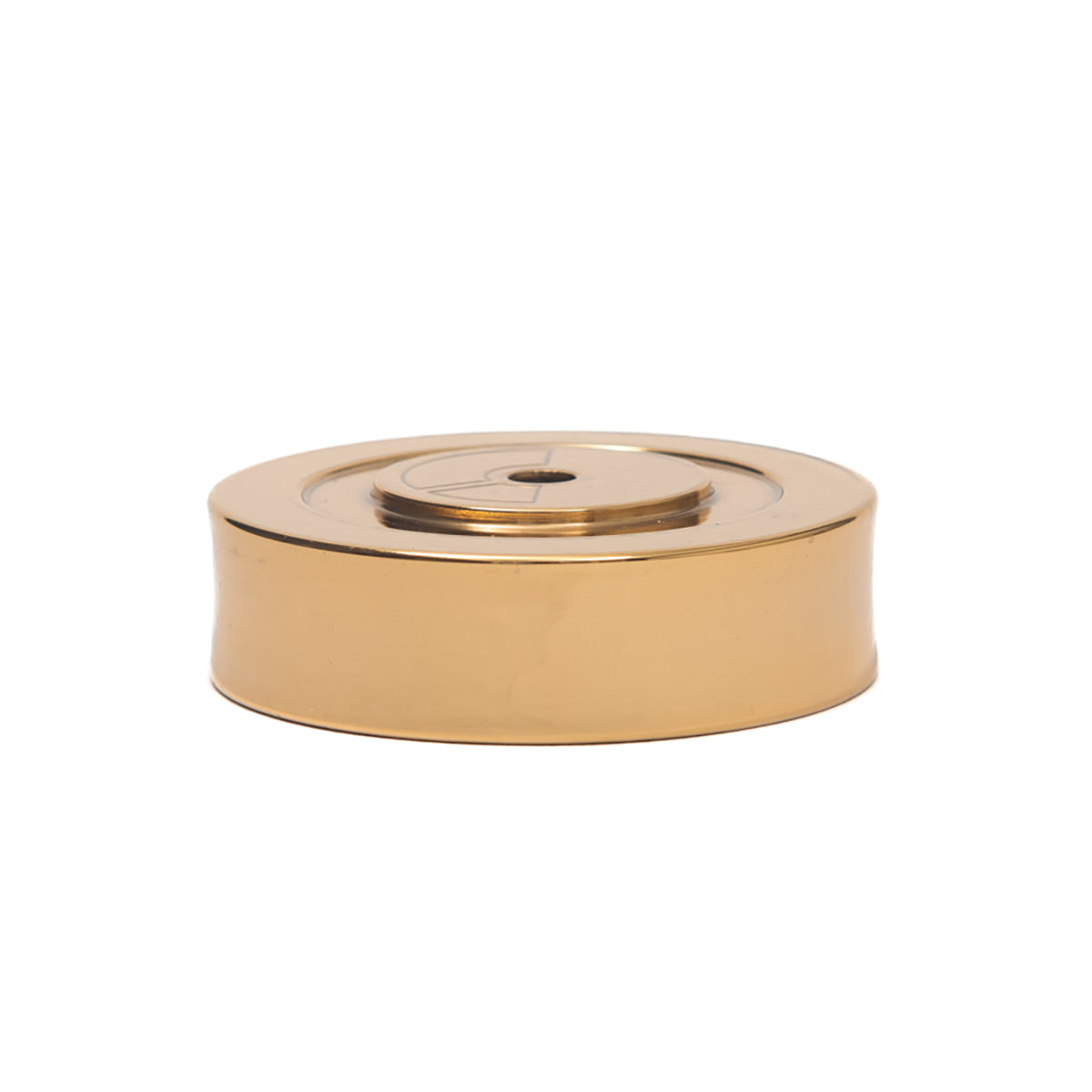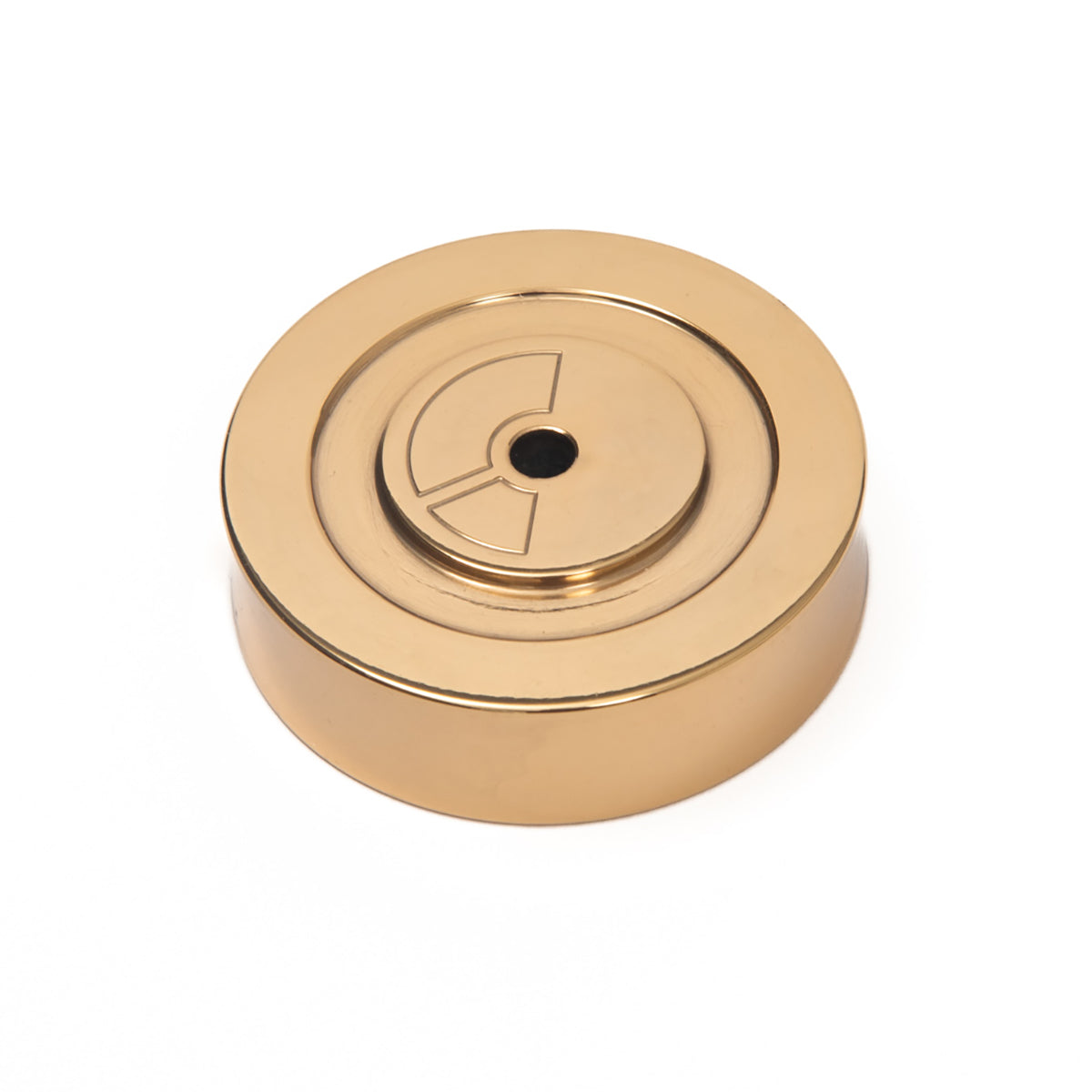 Our pt.AUDIO Gold Record Weight is made out of 800g of solid copper and then plated with 24k gold. As a limited edition, special holiday run of the Copper, we now offer stability for your vinyl playback in a new material, geometry and a lower profile - plated in beautiful gold. This extremely limited run features the PTA roundel logo on the top, which also acts as a 45 adapter. Machined, plated and finished in the USA.